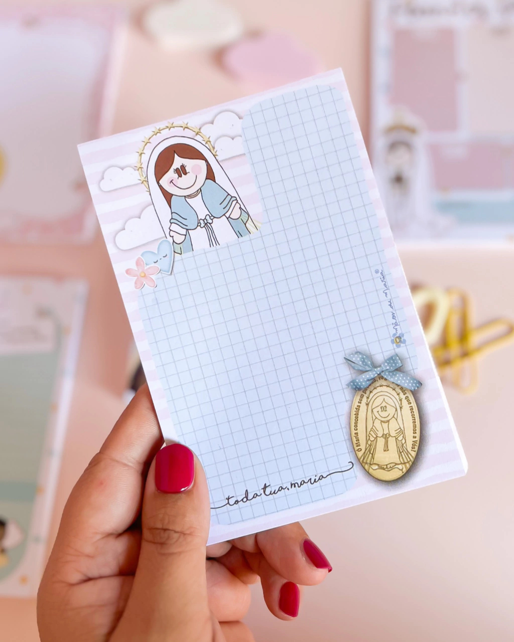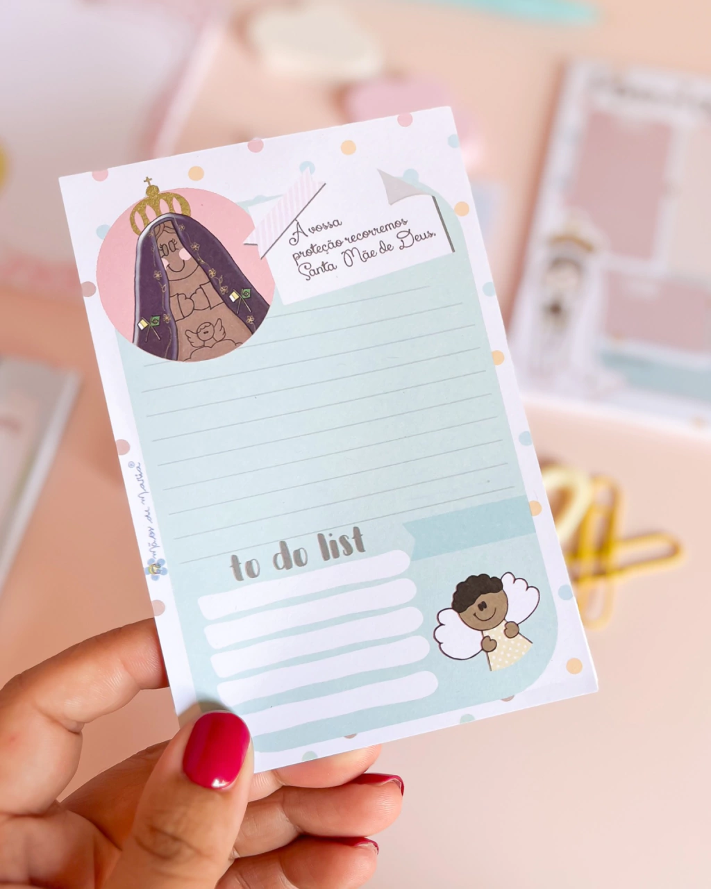 Tenha seu dia mais organizado com estes bloquinhos de anotações estampados com santinhos e ilustrações católicas exclusivas do Atelier Mãos de Maria.