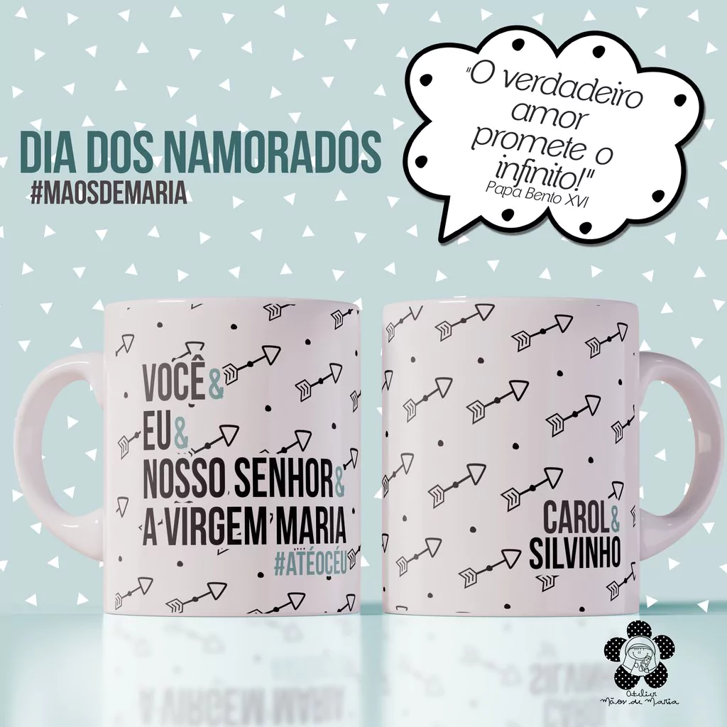 Agora não é mais, pois o ATELIER MÃOS DE MARIA pensa com carinho nos casais católicos para que possam oferecer presentes que retratem o sentido real do namoro e matrimômonio católico. As CANECAS DIA DOS NAMORADOS são personalizadas. Por isso, não se esqueça de deixar os nomes a serem impressos na caneca.
