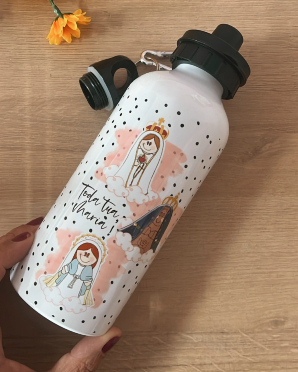 Transforme seu dia a dia em uma pequena oração e leve consigo a presença de Maria aonde for. Não perca a chance de ter essa linda garrafinha personalizada!